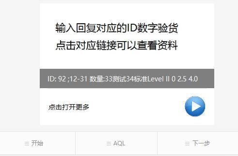 1.开始验货请点击‘开始’按钮,如果有上次未结束的验货,需要点击结束验货后才能进行新验货。正常情况下点击开始后会提示输入要验货的工作ID号码,就是在输入框回复ID的数字就可以。点击链接可以打开查看每个工作的详细资料